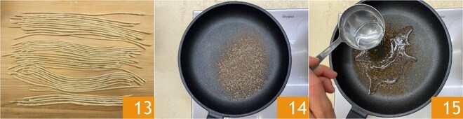 Nachdem Sie alle Pici geformt haben 13, bringen Sie einen Topf mit reichlich leicht gesalzenem Wasser zum Kochen. Rösten Sie inzwischen den Pfeffer in einer Pfanne 14, indem Sie mit einer Kelle Nudelkochwasser 15 ablöschen.