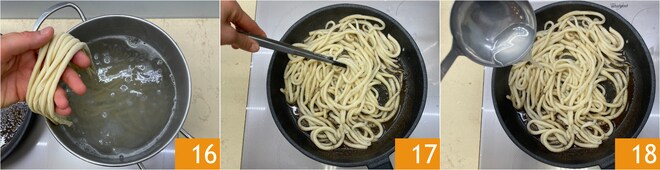 Werfen Sie die Pici in das kochende Wasser 16 und heben Sie sie direkt in die Pfanne mit dem Pfeffer 17, dann fügen Sie noch etwas Kochwasser hinzu 18.