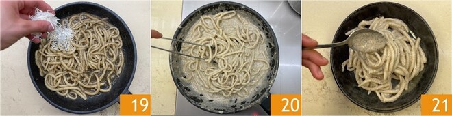 Fügen Sie den geriebenen Pecorino abseits der Hitze hinzu 19 und mischen Sie gut, um alles zu verbinden 20. Servieren Sie die Pici mit der Cacio e Pepe-Sauce 21.