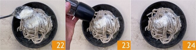 Vervollständigen Sie das Gericht mit weiterem Pecorino 22 und einer Prise Pfeffer 23. Servieren Sie Ihre Pici Cacio e Pepe sofort 24!