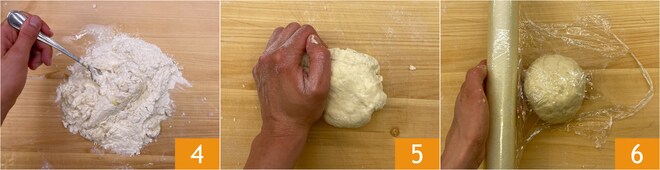 Beginnen Sie mit einer Gabel zu mischen, um das Mehl mit der Flüssigkeit zu verbinden 4, dann arbeiten Sie weiter mit den Händen 5, bis Sie einen glatten und homogenen Teig erhalten. Wickeln Sie den Teig in Frischhaltefolie 6 und lassen Sie ihn 30 Minuten im Kühlschrank ruhen.