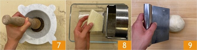 Zerstoßen Sie in der Zwischenzeit die schwarzen Pfefferkörner in einem Mörser 7 und reiben Sie den Pecorino 8. Nach der Ruhezeit nehmen Sie den Teig und teilen ihn in Portionen 9.