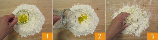 Um die Pici mit Datteltomaten und Ricotta mit Zitronenaroma zuzubereiten, bereiten Sie zuerst die frische Pasta vor: Geben Sie das Mehl als Vulkanform auf ein Nudelbrett und gießen Sie das Öl in die Mitte 1 und nach und nach das lauwarme Wasser 2, während Sie mit den Händen mischen 3.