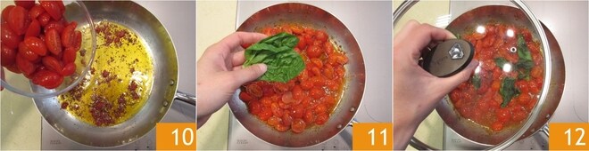 Fügen Sie nun die Tomaten hinzu 10 und braten Sie sie bei starker Hitze etwa 5 Minuten an, salzen Sie mäßig und fügen Sie das Basilikumsträußchen hinzu 11. Decken Sie die Pfanne mit einem Deckel ab 12 und kochen Sie bei niedriger Hitze 15 Minuten. Wenn die Sauce eingedickt ist, schalten Sie die Hitze aus und entfernen Sie das Basilikum.