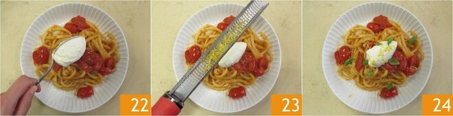 Vervollständigen Sie jeden Teller mit einem Löffel der geschlagenen Ricotta 22, geriebener Zitronenschale 23, einer Prise Pfeffer und ein paar Basilikumblättern. Ihre Pici mit Datteltomaten und Ricotta mit Zitronenaroma sind bereit, serviert zu werden 24!