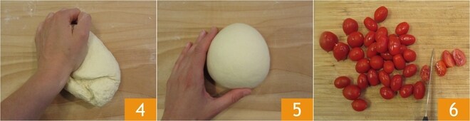 Arbeiten Sie die Mischung, bis Sie einen ziemlich festen, glatten und homogenen Teig erhalten 4. Formen Sie eine Kugel 5, decken Sie sie mit der umgedrehten Schüssel ab und lassen Sie sie 30 Minuten bei Zimmertemperatur ruhen. In der Zwischenzeit waschen und halbieren Sie die Tomaten 6.