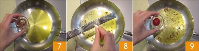 Fahren Sie mit der Zubereitung der Sauce fort: Erhitzen Sie das Öl in einer Pfanne mit den Sardellenfilets 7, dann fügen Sie den geriebenen Knoblauch 8 und das Tomatenmark 9 hinzu. Lassen Sie es ein paar Minuten anbraten.