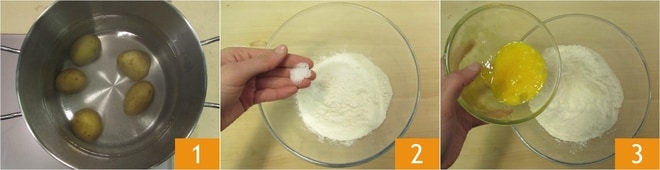 Um die Pierogi zuzubereiten, kochen Sie zuerst die Kartoffeln in kochendem Salzwasser; das dauert etwa 30 Minuten, die Zeit kann je nach Größe variieren 1. Bereiten Sie währenddessen den frischen Teig vor: In einer Schüssel Mehl, Salz 2 und die leicht geschlagenen Eier 3 geben.