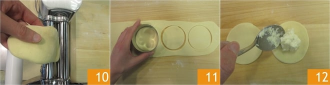 Nehmen Sie nun den Teig wieder heraus und rollen Sie ihn mit Hilfe einer Nudelmaschine auf eine Dicke von 2 mm aus 10. Stechen Sie Kreise mit einem Durchmesser von 8 cm aus 11 und füllen Sie jeden mit etwa 20 g Füllung 12.