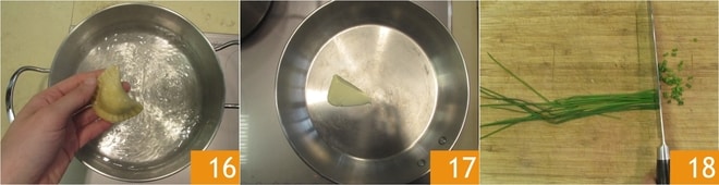 Wenn sie geformt sind, kochen Sie die Ravioli in kochendem Salzwasser etwa 5 Minuten lang 16. In der Zwischenzeit schmelzen Sie die Butter in einer Pfanne 17 und hacken den Schnittlauch 18.
