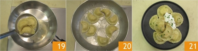 Seihen Sie die Ravioli in der Pfanne mit der Butter ab 19 und braten Sie sie ein paar Minuten lang an, indem Sie etwas Kochwasser hinzufügen 20. Servieren Sie die Pierogi mit einem Löffel saurer Sahne und Schnittlauch nach Belieben 21!