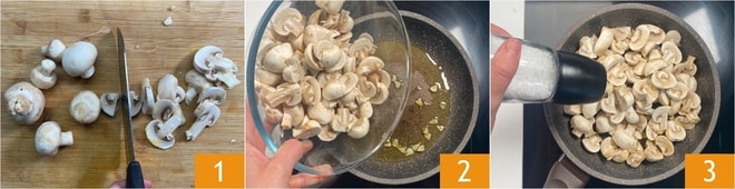 Um den Pilzburger zuzubereiten, entfernen Sie zuerst die erdige Basis der Champignons und schneiden Sie sie grob 1. Bereiten Sie in einer Pfanne ein Söfra mit dem Öl und den in Scheiben geschnittenen Knoblauch zu, fügen Sie dann die Pilze hinzu 2 und salzen Sie sofort 3.