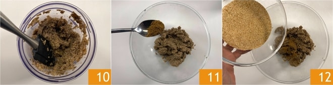 Betätigen Sie den Mixer, um die Pilze fein zu hacken 10. Geben Sie das Püree in eine Schüssel, dann fügen Sie den Kümmel 11 und die Semmelbrösel hinzu 12.