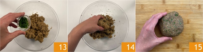 Würzen Sie mit einer Prise Salz, Pfeffer und gehackter Petersilie 13. Kneten Sie mit den Händen 14, bis Sie eine weiche und homogene Mischung erhalten 15.