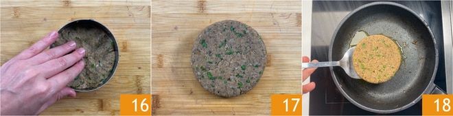 Verwenden Sie einen Dessertring mit demselben Durchmesser wie die Burgerbrötchen, um 4 Medaillons zu formen, und achten Sie darauf, die Mischung gut zu pressen 16 17. Erhitzen Sie in derselben Pfanne, in der Sie die Pilze gebraten haben, etwas weiteres Öl und legen Sie das erste Medaillon hinein 18.