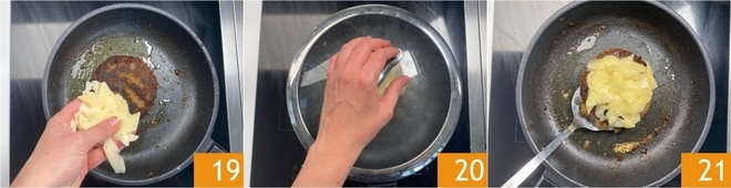 Braten Sie es 3-4 Minuten bei mittlerer Hitze, dann wenden Sie es vorsichtig und fügen die Fontina-Scheiben hinzu 19. Decken Sie es mit einem Deckel ab und lassen Sie es noch ein paar Minuten garen 20. Sobald der Käse geschmolzen ist, nehmen Sie den Burger aus der Pfanne 21 und wiederholen Sie den Vorgang für die anderen.