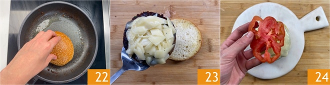 Bevor Sie Ihre Brötchen zusammenfügen, können Sie das Brot rösten, indem Sie die geschnittene Seite in dieselbe Pfanne legen, in der Sie die Medaillons gebraten haben, damit sie mit dem Bratfett gewürzt werden 22. An dieser Stelle können Sie den Pilzburger mit Käse auf die Basis des Brötchens legen 23, dann eine Scheibe Tomate hinzufügen 24.