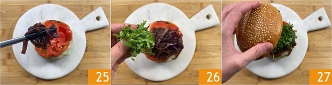 Beenden Sie mit den karamellisierten Zwiebeln 25 und feinen Chicorino-Streifen 26. Decken Sie mit der anderen Hälfte des Brötchens 27 und fügen Sie auch die anderen zusammen. Ihr Pilzburger ist bereit, genossen zu werden!