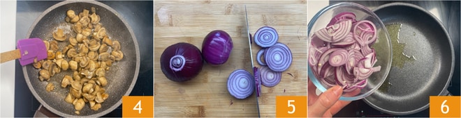 Braten Sie die Pilze bei mittlerer Hitze etwa 10 Minuten lang an und rühren Sie dabei häufig um, dann schalten Sie die Hitze aus und lassen Sie sie abkühlen 4. In der Zwischenzeit die Zwiebeln schälen und in dünne Ringe schneiden 5. Geben Sie die Zwiebeln in eine Pfanne mit dem heißen Öl 6.