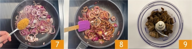 Fügen Sie den braunen Zucker hinzu 7 und kochen Sie bei mittlerer Hitze etwa 5 Minuten lang 8. Legen Sie die karamellisierten Zwiebeln zur Seite und geben Sie die abgekühlten Pilze in einen Mixer 9.