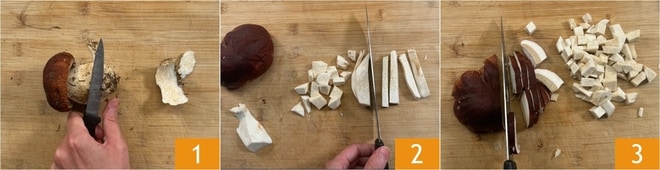 Um das Pilzrisotto zuzubereiten, bereiten Sie zuerst die Gemüsebrühe zu und halten Sie sie warm. Wie man Steinpilze putzt: Entfernen Sie den erdigen Teil des Stiels 1, dann entfernen Sie die Rückstände mit einem Papiertuch oder einem Pinsel. Trennen Sie den Stiel und schneiden Sie ihn in Würfel 2, dann schneiden Sie den Hut in Scheiben 3.