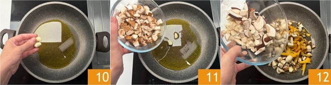 Erhitzen Sie in einer großen Pfanne etwas Öl mit der in zwei Hälften geschnittenen Knoblauchzehe, der Sie den inneren Keim entfernt haben 10. Fügen Sie die Portobello-Pilze 11, die Pfifferlinge, die Champignons und die Steinpilze hinzu 12.