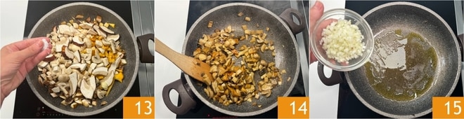 Salzen Sie 13 und kochen Sie bei starker Hitze etwa 8 Minuten, gelegentlich umrühren. Wenn sie schön gefärbt sind 14, entfernen Sie den Knoblauch und stellen Sie ihn beiseite. In derselben Pfanne geben Sie einen weiteren Schuss Öl und die gehackte Zwiebel 15.