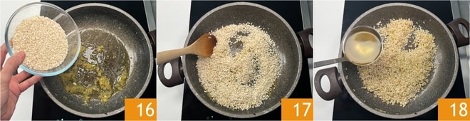 Braten Sie die Zwiebel sanft an, bis sie weich und durchscheinend wird, dann fügen Sie den Reis hinzu 16 und rösten ihn unter häufigem Rühren 17. Wenn die Körner warm sind, gießen Sie den Reis mit einer Kelle heißer Brühe ab 18. Kochen Sie den Reis, indem Sie ihn jeweils mit einer Kelle Brühe anfeuchten, und stellen Sie sicher, dass die Flüssigkeit immer absorbiert wurde, bevor Sie mehr hinzufügen.