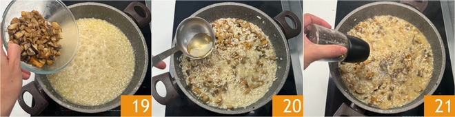3 Minuten vor Ende der Garzeit die Pilze hinzufügen 19, dann die Garzeit mit noch etwas Brühe abschließen 20 und nach Belieben pfeffern 21.