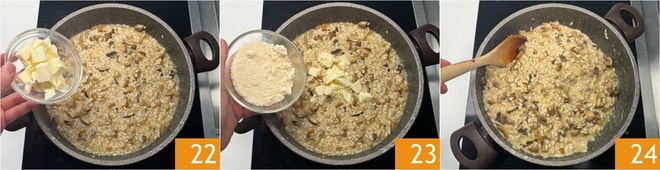 Wenn es fertig ist, schalten Sie die Hitze aus und verfeinern Sie mit der kalten Butter in Würfeln 22 und dem geriebenen Käse 23. Gut mischen, um zu integrieren 24, und servieren Sie Ihr Pilzrisotto sofort 24!