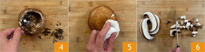 Gehen Sie zu den Portobello-Pilzen über: Kratzen Sie die Lamellen mit einem Teelöffel ab 4, reinigen Sie dann die Außenseite mit einem Papiertuch 5 und schneiden Sie sie in 1 cm große Würfel 6.