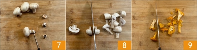 Entfernen Sie das Endstück des Stiels der Champignons 7 und der Pfifferlinge, entfernen Sie dann die erdigen Rückstände. Schneiden Sie die Champignons in Viertel 8 und die Pfifferlinge je nach Größe in 2 oder 3 Teile der Länge nach 9. Schließlich schälen und hacken Sie die Zwiebel fein.