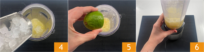Fügen Sie das Eis 4, ein paar Tropfen Limettensaft 5 hinzu und mixen Sie alles 6.