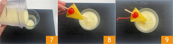 Gießen Sie den Cocktail in das Glas 7 und garnieren Sie ihn mit einer Ananasscheibe und einer Maraschinokirsche 8. Die Pina Colada ist bereit, genossen zu werden 9!