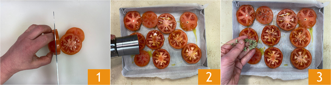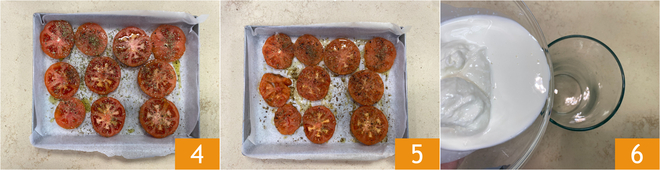 Um die Pinsa mit gerösteten Tomaten, Burrata und Kochschinken zuzubereiten, beginnen Sie mit den Tomaten. Nachdem Sie sie gewaschen und getrocknet haben, schneiden Sie sie in Scheiben von 1 cm Dicke 1. Legen Sie sie auf ein mit Backpapier belegtes Blech und würzen Sie mit Öl, Salz, Pfeffer 2 und dann mit Oregano 3.