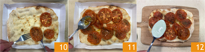 Legen Sie den Pinsa-Boden auf ein mit Backpapier belegtes Blech, belegen Sie ihn mit den gerösteten Tomaten 10 und dem ausgelaufenen Saft, den sie beim Backen freigegeben haben 11. Backen Sie ihn weitere 5 Minuten bei 2200, nehmen Sie ihn dann aus dem Ofen und legen Sie ihn auf ein Schneidebrett. Anschließend mit der Burrata-Sauce bestreichen 12.