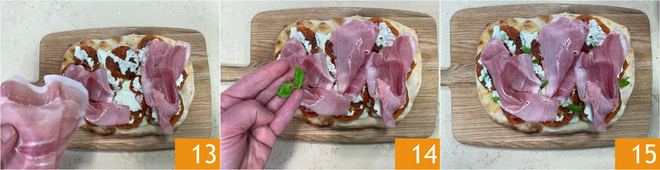 Garnieren Sie mit den Scheiben Kochschinken 13 und einigen Basilikumblättchen 14 – fertig ist Ihre Pinsa mit gerösteten Tomaten, Burrata und Kochschinken 15.