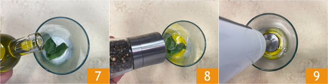 Fügen Sie Basilikumblätter, Öl 7, Salz und Pfeffer 8 hinzu und pürieren Sie alles; stellen Sie die Sauce beiseite 9.