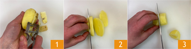Um die Pinsa mit Wurst und Kartoffeln zuzubereiten, beginnen Sie mit den Kartoffeln: Schälen Sie sie 1 und schneiden Sie sie zuerst in Scheiben 2 und dann in Würfel von etwa 1,5 cm 3.<\/p>