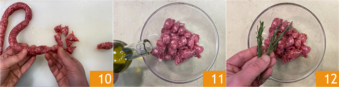 Inzwischen kümmern Sie sich um die Wurst: entfernen Sie die Pelle und zerbröckeln Sie sie mit den Händen in etwa 2 cm große Stücke 10. Geben Sie die Wurst in eine Schüssel und würzen Sie sie mit Öl 11 und Rosmarin 12.<\/p>