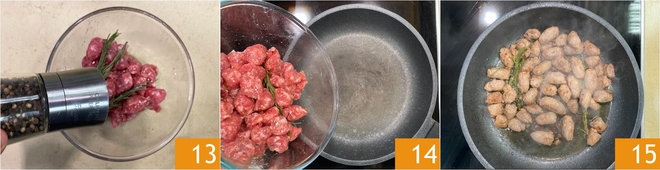 Leicht salzen, pfeffern 13 und gut mischen. Erhitzen Sie eine Antihaftpfanne gut, dann fügen Sie die Wurst hinzu 14 und braten Sie sie etwa 5 Minuten an, dann zur Seite stellen 15.<\/p>