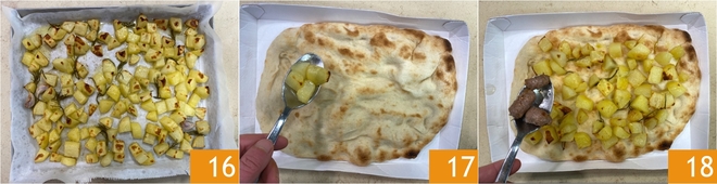 Nach Ablauf der Backzeit holen Sie die Kartoffeln aus dem Ofen 16. Nehmen Sie nun die Pinsa-Böden und verteilen Sie die gerösteten Kartoffeln auf der Oberfläche 17, dann fügen Sie auch die angebratene Wurst hinzu 18.<\/p>