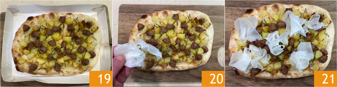 Backen Sie bei 250° in Umluftmodus für 5 Minuten 19, dann mit dem Raspadura-Käse 20 vollenden. Ihre Pinsa mit Wurst und Kartoffeln ist bereit zum Genießen 21!<\/p>
