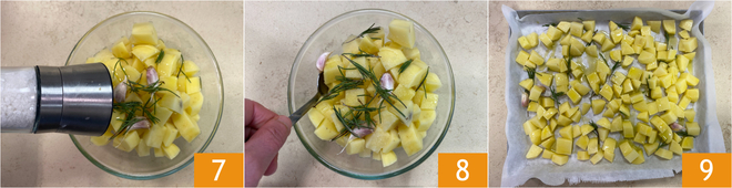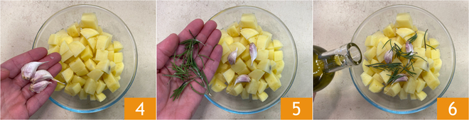 Geben Sie die Kartoffelwürfel in eine Schüssel, dann würzen Sie mit den ungeschälten Knoblauchzehen 4, den Rosmarinnadeln 5 und dem Öl 6.<\/p>