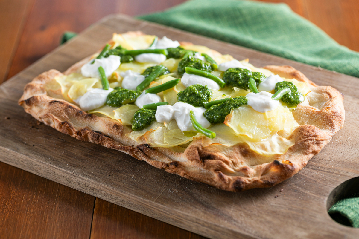 Die genuesische Pinsa orientiert sich an den typischen Aromen der Region Ligurien und an den Zutaten, die ein charakteristisches Gericht ihrer Küche ausmachen: den Trenette mit Pesto, Kartoffeln und grünen Bohnen. In diesem Fall wird die Pasta durch den Pinsa-Boden ersetzt, außen knusprig und innen luftig, bereit, mit dünnen Kartoffelscheiben, selbstgemachtem Pesto alla Genovese und grünen Bohnen belegt zu werden. Dazu kommt die frische, cremige Note der prescinseua, einem regionalen Käse mit leicht säuerlichem Geschmack, die unbedingt erst nach dem Backen hinzugefügt werden sollte.