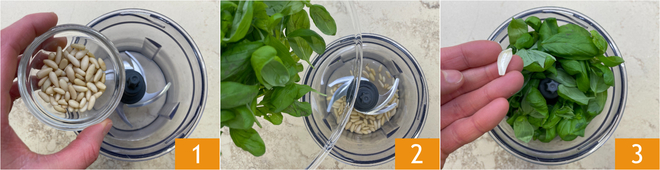 Um die genuesische Pinsa zuzubereiten, beginnen Sie mit dem Pesto: Geben Sie in einen Mixer mit Klingen die Pinienkerne 1, die Basilikumblätter 2 und eine halbe Knoblauchzehe 3.