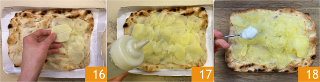 Nun nehmen Sie den Pinsa-Boden und legen die Kartoffelscheiben leicht überlappend auf die Oberfläche 16, beträufeln alles mit etwas Öl 17 und backen ihn in einem vorgeheizten Umluftofen bei 250 °C für 5 Minuten. Nach Ablauf der Zeit aus dem Ofen nehmen und kleine Häufchen prescinseua darauf verteilen 18.