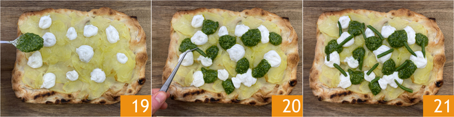 Mit Basilikumpesto 19 und den grünen Bohnen 20 fertigstellen. Ihre genuesische Pinsa ist bereit zum Servieren 21!