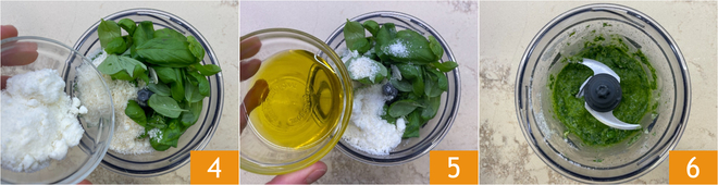 Fügen Sie den frisch geriebenen Parmigiano Reggiano und Pecorino 4 hinzu, dann geben Sie das Öl 5 und das Salz dazu. Mixen Sie in Intervallen so kurz wie möglich, gerade so lange, bis eine homogene Masse entsteht 6. Beiseitestellen.