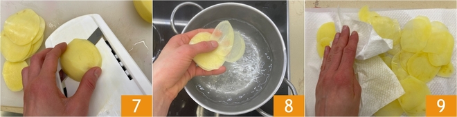 Kommen wir zu den Kartoffeln: Schälen Sie sie und schneiden Sie sie mit einer Mandoline in Scheiben von etwa zwei Millimetern Dicke 7. Blanchieren Sie die Kartoffelscheiben in gesalzenem Wasser für circa 2 Minuten 8, dann abgießen, auf Küchenpapier legen und gut trocken tupfen 9.